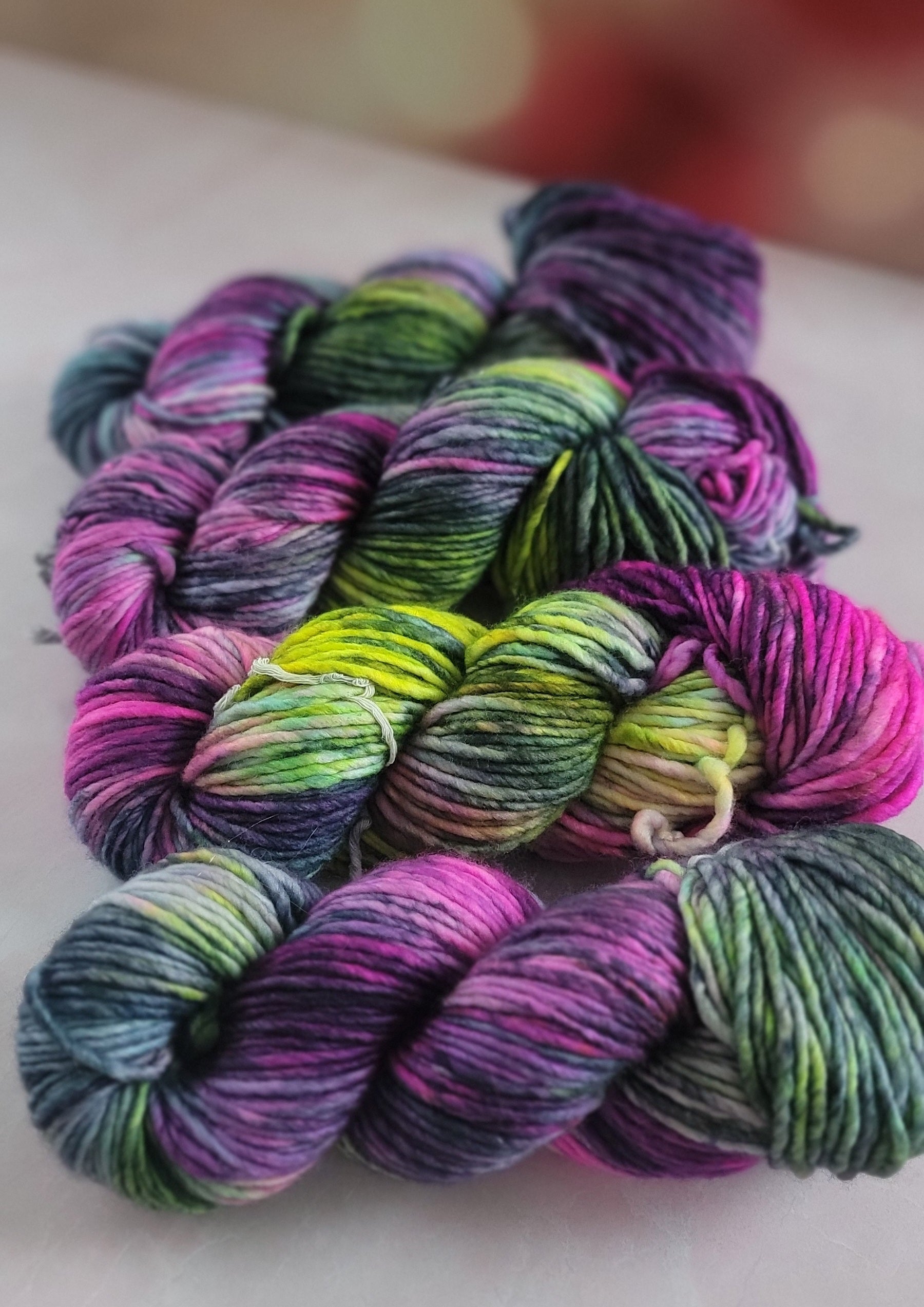 This is a listing for one skein of hand dyed light bulky weight, 100% Superwash Merino wool. Single Ply