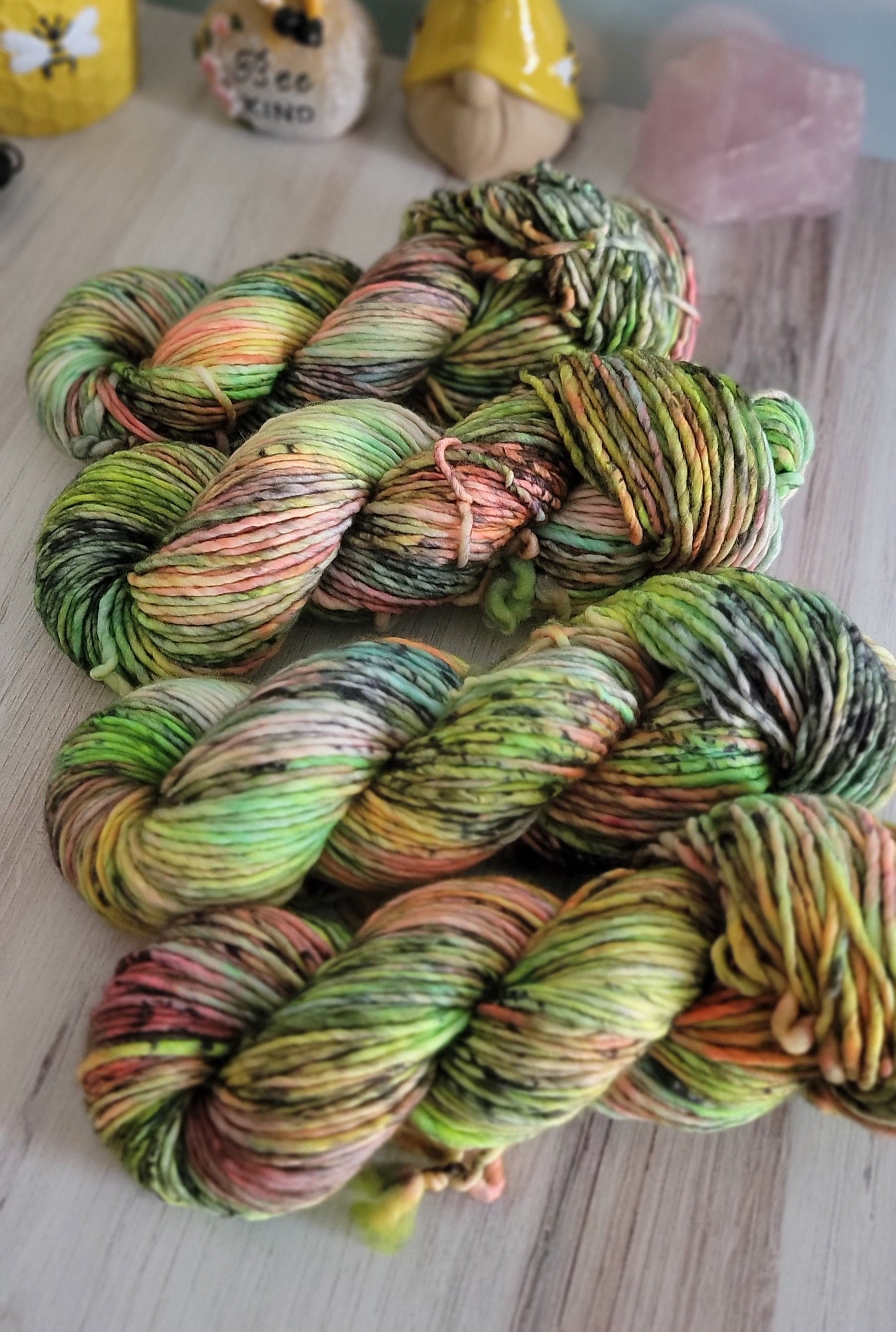This is a listing for one skein of hand dyed light bulky weight, 100% Superwash Merino wool. Single Ply