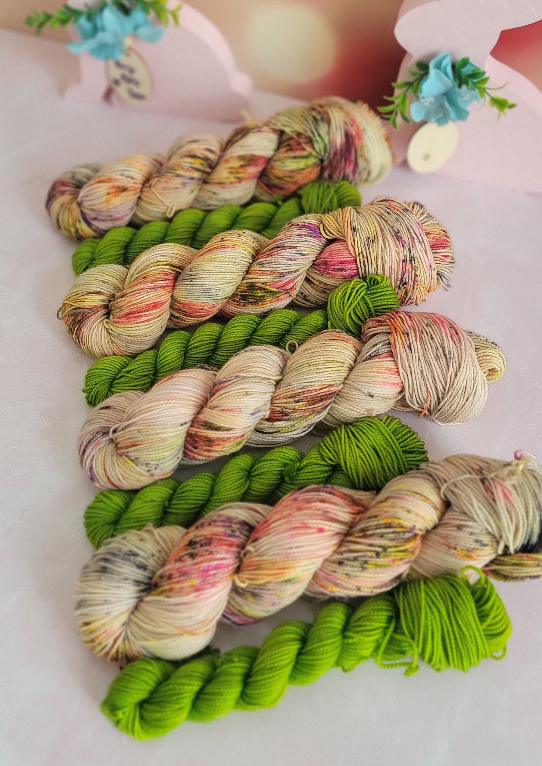 This listing is for one 100g skein of sock weight yarn and one 20g mini skein of sock weight yarn
